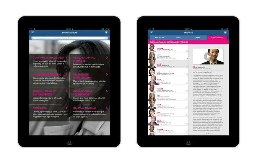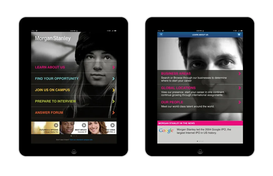 This app was designed for the iPad and iPhone to engage graduating candidates and inform them of the career opportunities at Morgan Stanley.